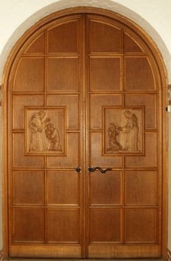 Adgangen til kirken sker gennem våbenhuset via en flot egetræsdør. Døren blev fornyet i 1952 i forbindelse med kirkens 50 års jubilæum, og de to relieffer, som viser munken Ansgar, der udfører de to sakramenter; dåben og nadveren, er skåret af Axel og Bertram Jacobsen - sønner af kirkens arkitekt.