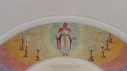 Fresken henter motivet fra Åbenbaringsbogen og gengiver teksten. Man ser Kristus, der kommer på himlens skyer ved dommedag. Han er omringet af 7 lysestager, der er symboler på kirkehistoriens store menigheder, heriblandt den danske. Tolkningen bygger på Grundtvigs store visionære digt “Christenhedens Syvstjerne”. Symbolsk er også stjernebolden i Kristi hånd.
