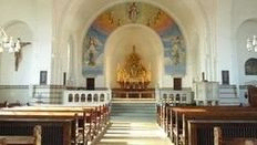 Når man står ved døren, er noget af det mest iøjenfaldende i kirken freskomaleriet på triumfvæggen.